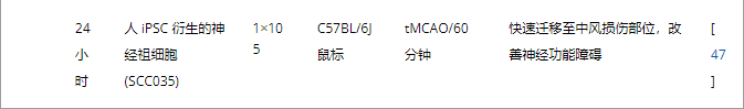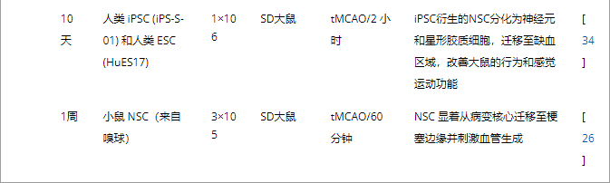 表2:腦內(心室和紋狀體)NSC移植治療腦缺血的代表性實驗研究。