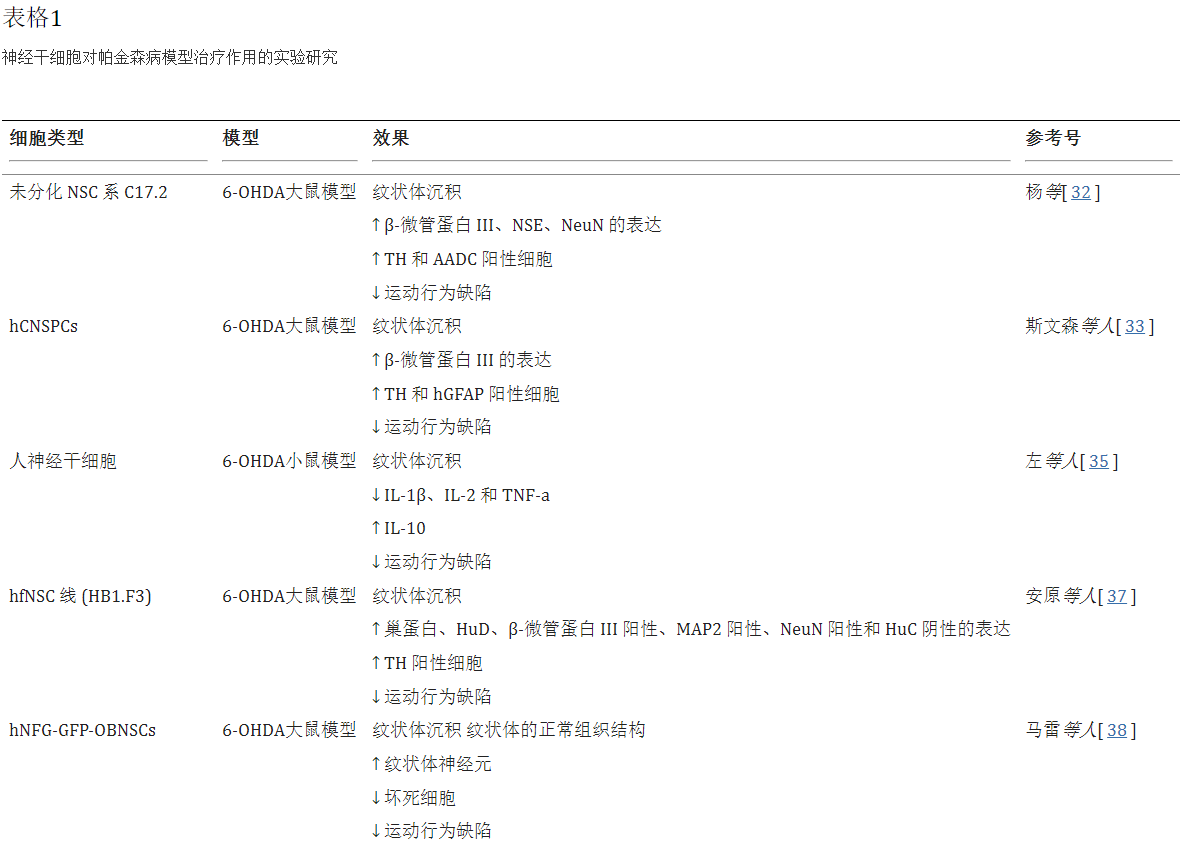 多項(xiàng)臨床前研究表明,不同類型的人類神經(jīng)干細(xì)胞移植后,可以在特定的大腦部位遷移、存活和增殖。免疫組織化學(xué)檢查支持的證據(jù)表明,移植的人類神經(jīng)干細(xì)胞可以轉(zhuǎn)化為功能性神經(jīng)元并整合到神經(jīng)回路中。體內(nèi)研究已證明神經(jīng)干細(xì)胞移植是治療帕金森病的有效方法(表格1)。