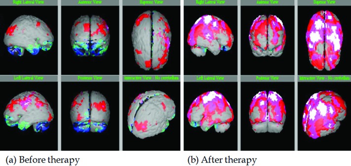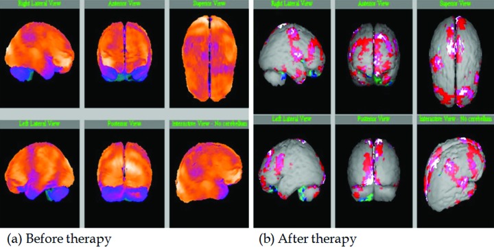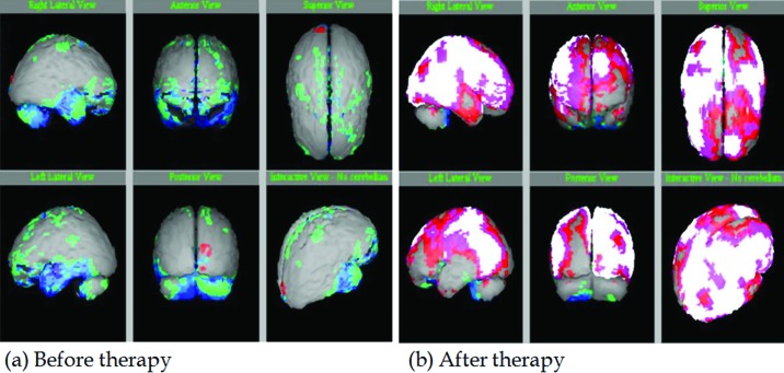 第二次治療后的大腦SPECT掃描顯示左側小腦區域有輕微的灌注不足。大腦和小腦區域的灌注顯著改善。圖1代表患者在第二次治療之前和之后的SPECT掃描圖像。