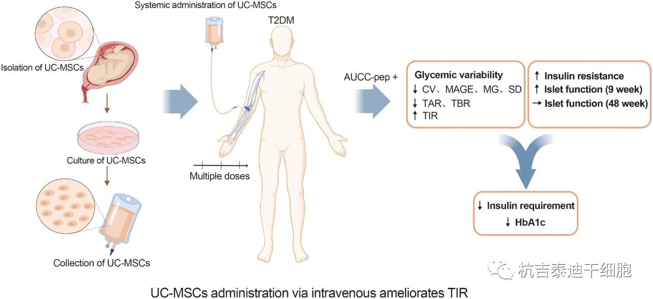 該篇文章發布在《干細胞轉化醫學》雜志上,數據結果表明顯示,通過靜脈輸注給予UC-MSC顯著增加TIR,并且具有較高AUCC-pep的男性患者更有可能從UC-MSC治療中受益。UC-MSCs移植可能是中國成人T2DM的一種潛在治療方法。