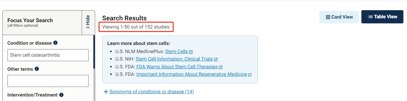 截至2023年10月26日,在美國國立衛生研究院的最大臨床試驗注冊庫http://clinicaltrials.gov網站上注冊的有關干細胞治療骨關節炎的臨床研究項目達到了152余項,其中一部分已經完成了臨床試驗,以及安全性和有效性的初步評價。東亞、西歐、中東和美國是干細胞臨床治療研究的主要地區。