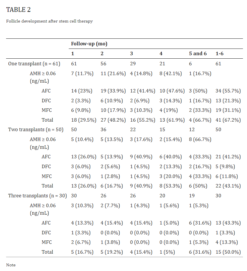 通過超聲引導下經陰道注射將臍帶間充質干細胞移植給患者,結果定義為干細胞治療后每月成熟卵母細胞的數量(表2)。所有患者均接受了第一輪手術;但部分患者未能接受第二輪和第三輪移植,導致數例失訪。術后每月收集AMH、竇卵泡(AFC)、優勢卵泡數(DFC)和成熟卵泡數(MFC)的數據。特別是,我們只能在第一次移植五個月后獲得六名患者的結果;因此,我們將第5個月和第6個月的數據整合到一個項目中以更加直觀。