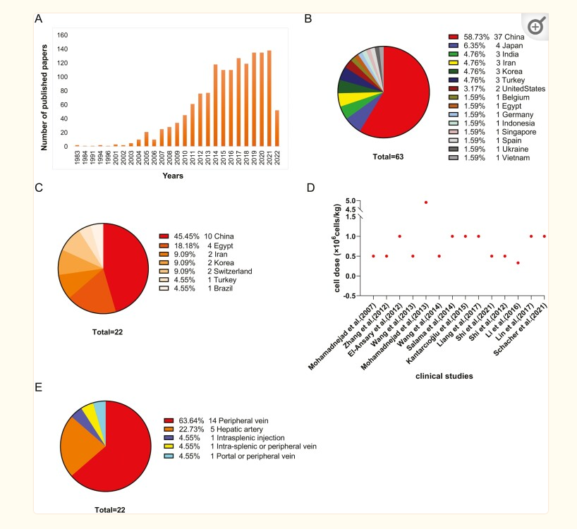 A.與肝病間充質干細胞或間充質基質細胞研究相關的已發表論文數量。這些數據是在2022年4月29日獲得的(總計=1290)。