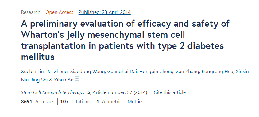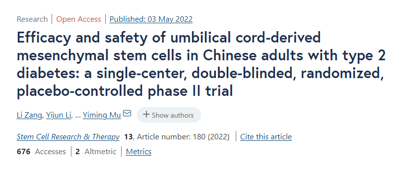 此外,解放軍總醫(yī)院內分泌科母義明教授、生物治療中心韓衛(wèi)東教授等人也在Stem Cell Res Ther期刊上發(fā)表了一項單中心、隨機、雙盲、安慰劑對照試驗的結果,考察了臍帶間充質干細胞治療2型糖尿病的有效性和安全性。