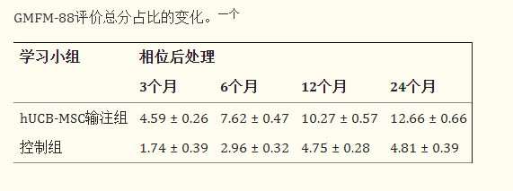 兩組之間的基線功能評估(包括GMFM-88量表分數和CFA分數)沒有觀察到顯著差異。輸注hUCB-MSC后相對于基線狀態的改善在輸注組中顯著高于對照組。