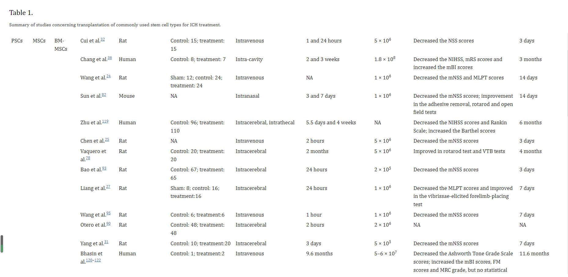 間充質干細胞 (MSCs)、神經干細胞 (NSCs)、誘導多能干細胞 (iPSCs) 和造血干細胞 (HSCs) 是治療 ICH 的最常見類型的多能干細胞 (PSC)。MSCs包括骨髓間充質干細胞(BM-MSCs)、人臍帶間充質干細胞(HUC-MSCs)和脂肪來源的間充質干細胞(ADMSCs)。
