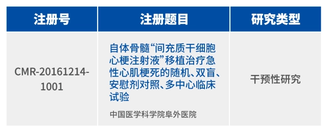 2016年年底,在我國醫學研究備案登記信息系統中,干細胞臨床研究項目《自體骨髓“間充質干細胞心梗注射液”移植治療急性心肌梗死的隨機、雙盲、安慰劑對照、多中心臨床試驗》獲得國家備案,得到了國家干細胞臨床研究專家委員會的集體認可。