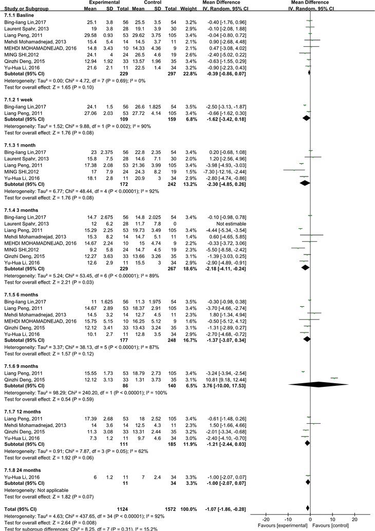 與對照組相比,干細胞治療后ALT水平顯著降低(p<0.00001)(圖5)。亞組分析顯示,干細胞治療組ALT水平也有所降低,在1周、1個月和6個月時間點均低于基線和相應對照組。干細胞治療后9、12和24個月時ALT水平無顯著差異。關于1周、6和9個月時的ALT水平,未發現異質性。但是,應考慮1、3和12個月時 ALT水平的異質性。但這只能通過一兩項研究來解釋。