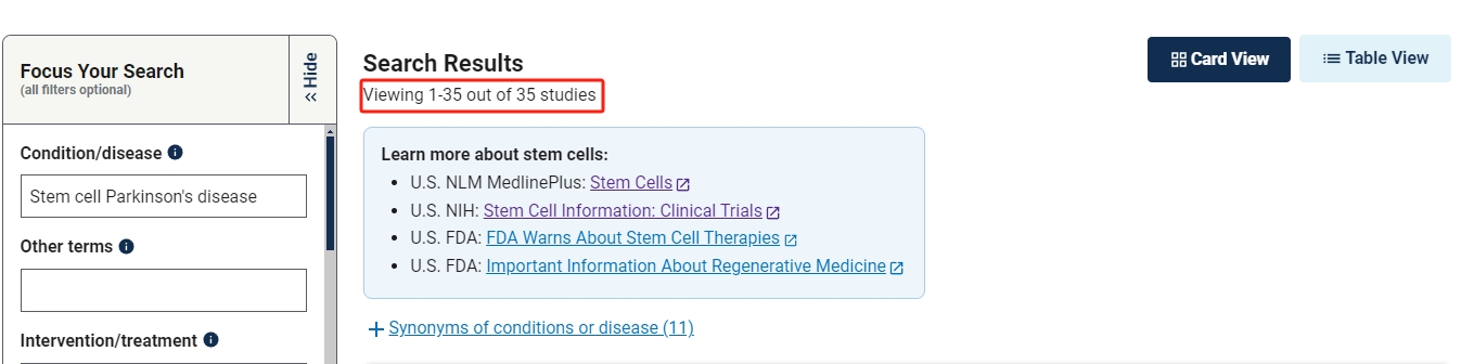 截止2024年2月,在美國國立衛生研究院的最大臨床試驗注冊庫clinicaltrials.gov網站上注冊的有關干細胞治療帕金森病的臨床研究項目有35項。