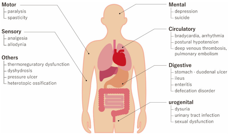 脊髓損傷(SCI)主要由交通事故、跌倒和運(yùn)動相關(guān)損傷等嚴(yán)重外傷引起,全世界有超過 100 萬患者患有 SCI 相關(guān)癱瘓。隨著社會老齡化進(jìn)程的加快,老年SCI患者因低能量跌倒而增多。SCI 不僅會導(dǎo)致運(yùn)動功能缺陷,例如癱瘓,還會導(dǎo)致許多其他嚴(yán)重的醫(yī)療問題,包括呼吸系統(tǒng)、泌尿生殖系統(tǒng)和皮膚問題(圖1) 。除了嚴(yán)重的醫(yī)療問題外,SCI患者通常都很年輕,需要更長時(shí)間的醫(yī)療和社會護(hù)理,導(dǎo)致嚴(yán)重的社會經(jīng)濟(jì)問題,不僅對患者及其護(hù)理人員,而且對社會也是如此。
