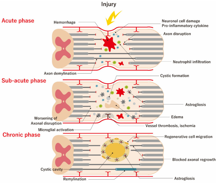 SCI包括兩種截然不同的機(jī)制。一種是脊髓受壓挫傷引起的原發(fā)性損傷,導(dǎo)致?lián)p傷時(shí)神經(jīng)元和神經(jīng)膠質(zhì)細(xì)胞膜的損傷以及微血管系統(tǒng)的破壞。另一種是繼發(fā)性損傷級聯(lián),包括出血和水腫引起的組織腫脹、炎癥、細(xì)胞毒性自由基和興奮性毒性物質(zhì)的產(chǎn)生以及過度神經(jīng)膠質(zhì)增生,其發(fā)展需要數(shù)小時(shí)至數(shù)月。常規(guī)進(jìn)行超早期手術(shù)干預(yù),包括脊髓減壓和脊柱固定,但通常很難從SCI中完全恢復(fù),因?yàn)樵l(fā)性損傷在受傷時(shí)已經(jīng)發(fā)生。因此,目前脊髓損傷治療的主要目標(biāo)是減少或停止繼發(fā)性損傷級聯(lián),繼發(fā)性損傷級聯(lián)可分為急性(數(shù)日內(nèi))、亞急性(數(shù)日至6個(gè)月)和慢性(>6個(gè)月)相 (圖2)。