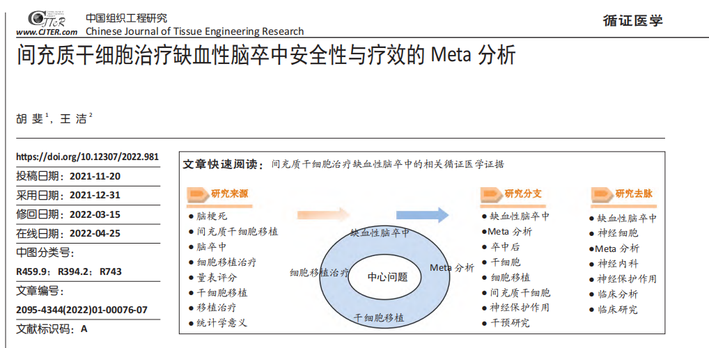 此外,在2021年,一篇發(fā)表于《中國組織工程研究》的一篇綜述,通過Meta分析明確間充質(zhì)干細(xì)胞治療缺血性腦卒中的安全性與療效,并提供相關(guān)循證醫(yī)學(xué)證據(jù)。