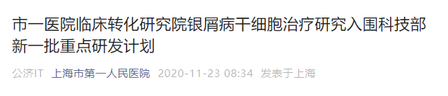 此外,2020年11月23號,科技部公布了新一批重點研發計劃。其中,由上海市第一人民醫院臨床轉化研究院王宏林教授任首席科學家,中南大學湘雅醫院、廈門大學和湖南光琇高新生命科技有限公司共同參與的“間充質干細胞治療銀屑病及銀屑病型關節炎的臨床研究”項目入圍“干細胞及轉化研究專項名單”,這也是上海市一醫院連續第二年獲得該重大專項。
