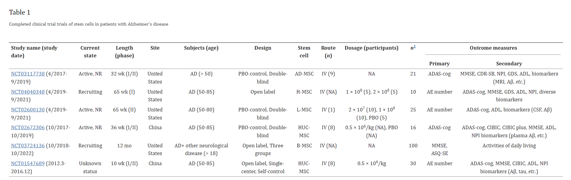 Aβ:淀粉樣蛋白-β;AD:阿爾茨海默病引起的癡呆癥;ADAS-Cog:阿爾茨海默病評估量表-認知分量表;AE:不良事件;NPI:神經精神病學量表;CSF:腦脊液;AD-MSC:自體脂肪組織來源的間充質干細胞;H-MSC:人間充質干細胞;L-MSC:白血病間充質干細胞;B-MSC:骨髓間充質干細胞;HUC-MSC:人臍帶血間充質干細胞;ADL:日常生活活動;NA:不可用;CDR-SB:臨床癡呆評定量表的總和;GDS:老年抑郁量表;MMSE:最低精神狀態檢查;CIDIC:Composite International Diagnostic Interview Core;PBO:安慰劑;IV:靜脈內;ASQ-SE:年齡和階段問卷-社會-情感。