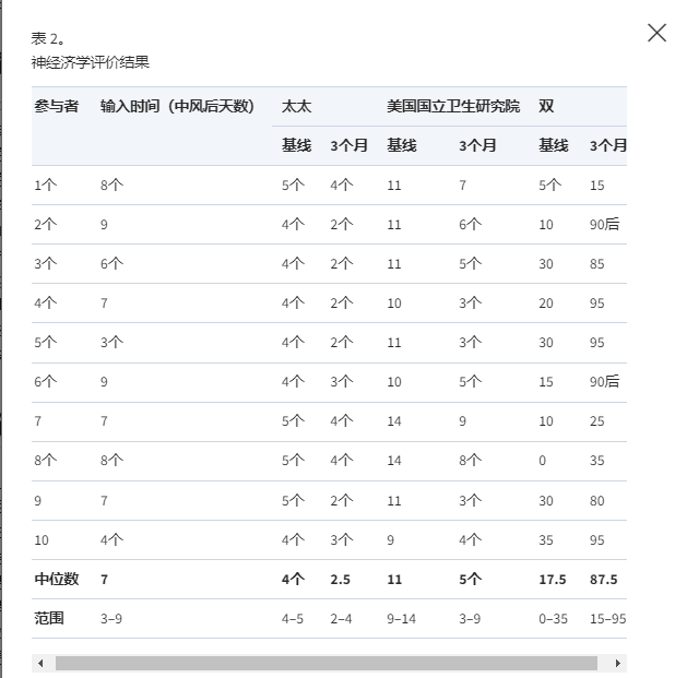 三個月后,所有參與者的mRS相對于基線(輸注時間)至少提高了一個等級,平均mRS為2.8±0.9(范圍 1-3分),表明結果有所改善。50%的受試者在mRS中表現出1級改善,40%改善 2級,10%(1名患者)改善 3級。NIHSS用于測量基線時和卒中后3個月因卒中引起的損傷,同樣證明了從輸注??時間(平均11.2±1.6;范圍9-14)到3個月評估(平均5.3±2.2;范圍3- 9),改善至少4分(平均5.9±1.4;范圍4–9)(表2)。