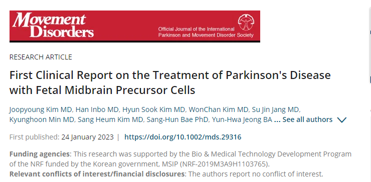 韓國大學盆唐醫療中心 (CBMC) 的研究人員證明了移植來自胎兒間充質干細胞的多巴胺神經前體細胞對帕金森病患者的安全性和有效性。