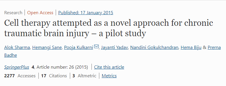 2015年,在一項小型的開放標(biāo)簽、非隨機(jī)、非對照的試驗研究中,Sharma等人通過鞘內(nèi)注射1×106個細(xì)胞/kg的自體BMMNCs治療14名慢性TBI的兒童和成人患者。在6個月時,3名患者的功能改善測量(FIM)有所改善,6名患者有所改善,7名患者的殘疾評分量表(DRS)沒有變化。此外,7名符合SF-8健康調(diào)查條件的患者在6個月時,身體部分的平均值和精神部分的平均值都有改善。