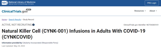 美國(guó)生物技術(shù)Celularity公司的NK細(xì)胞療法CYNK-001獲得FDA批準(zhǔn)在COVID-19成年患者開(kāi)展臨床試驗(yàn)的細(xì)胞免疫療法。該公司開(kāi)展了I/II期臨床研究,研究入組86名COVID-19患者。