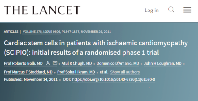2011年11月,國際醫學期刊《柳葉刀》報道了世界第一例接受干細胞治療心臟病的臨床試驗。65歲的邁克·瓊斯(Mike Jones)患有充血性心力衰竭(congestive heart failure),2009年7月,瓊斯成為世界上第一位接受干細胞移植療法的心力衰竭病人。