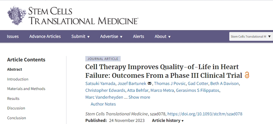 參考資料:Satsuki Yamada, Jozef Bartunek, Thomas J Povsic, Gad Cotter, Beth A Davison, Christopher Edwards, Atta Behfar, Marco Metra, Gerasimos S Filippatos, Marc Vanderheyden, William Wijns, Andre Terzic, Cell Therapy Improves Quality-of-Life in Heart Failure: Outcomes From a Phase III Clinical Trial, Stem Cells Translational Medicine, 2023;, szad078, https://doi.org/10.1093/stcltm/szad078