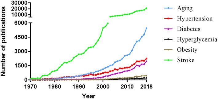 2018年12月在PubMed中進行了高級搜索,查找每年出版的所有使用文本單詞“筆劃”且給定術語作為文本單詞的文章:“年齡”或“老化”;高血壓或高血壓或高血壓;糖尿病或糖尿?。桓哐腔蚋哐腔蚋哐腔蚋哐撬?;或肥胖或超重??紤]了英語(而不是其他語言)文章的最終出版年份(而不是提前的在線日期)。