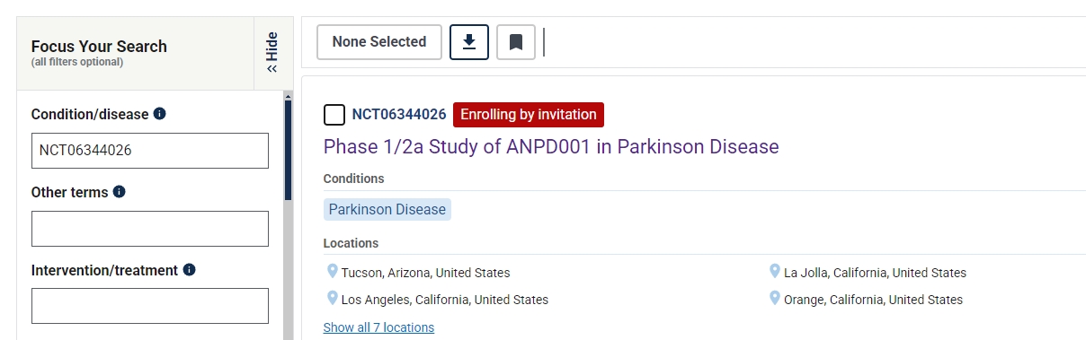 ANPD001是美國最先進的治療帕金森病的自體研究性新細胞療法。有關1/2a期試驗的更多信息,請訪問clintrials.gov (NCT06344026)。