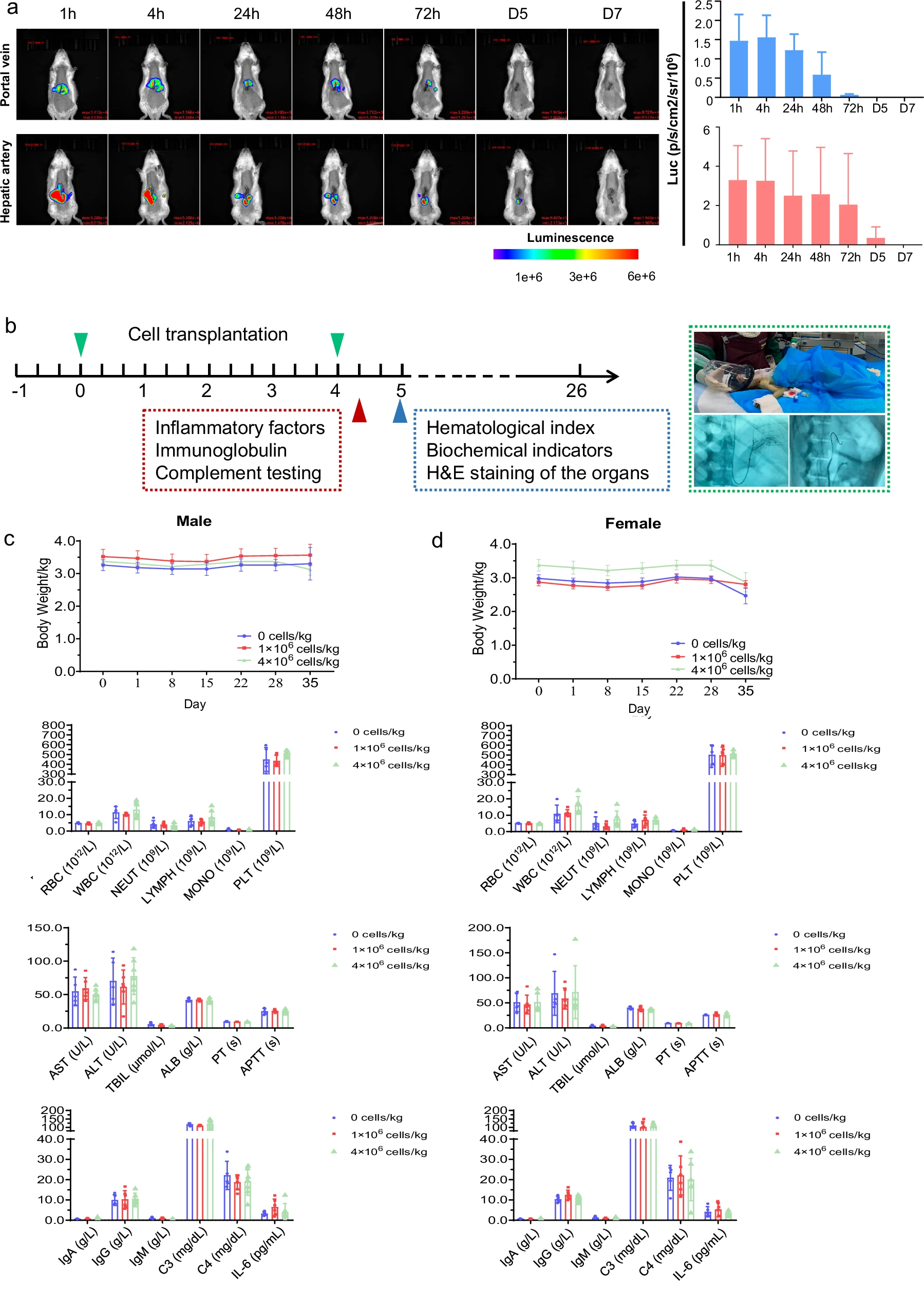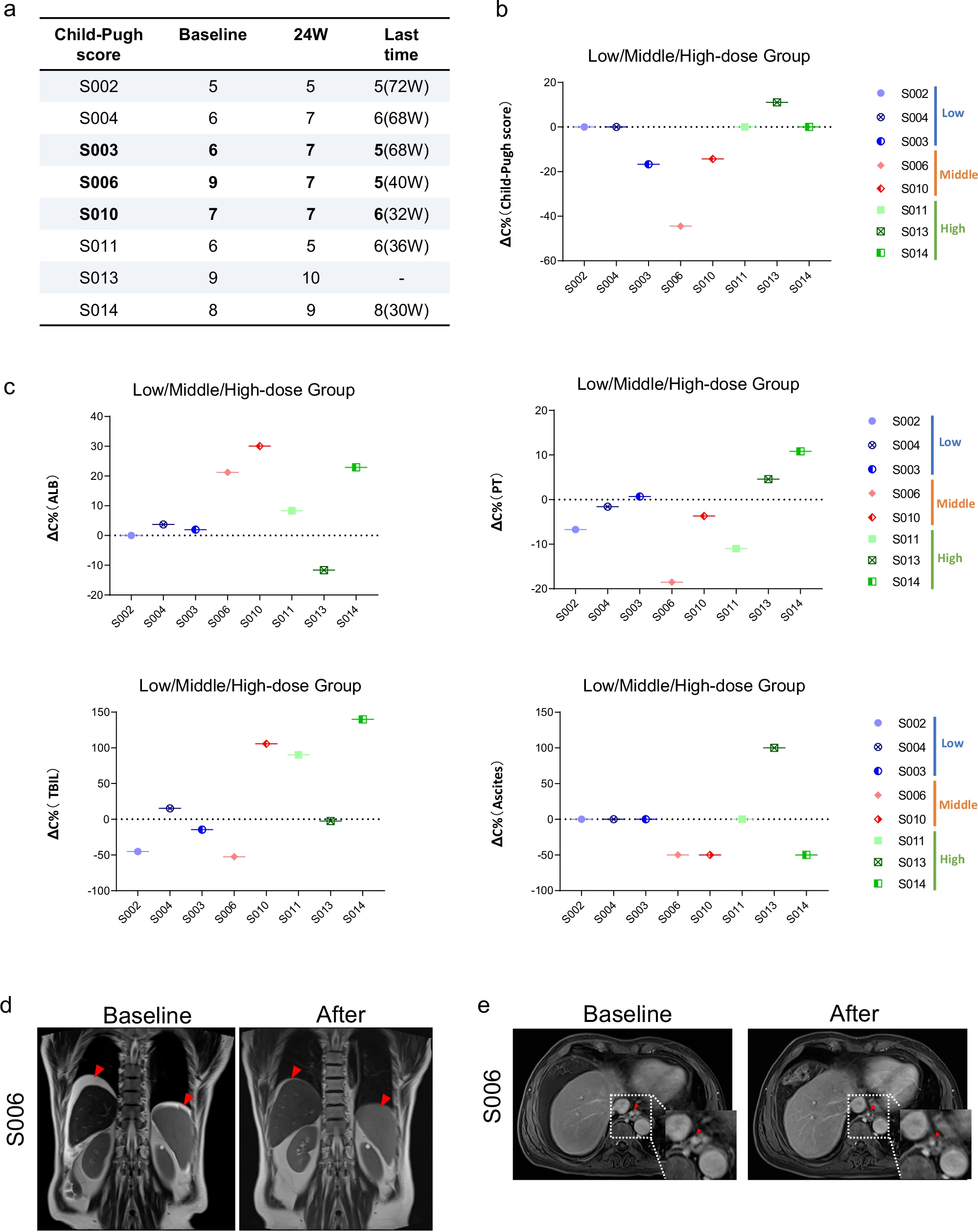 該研究在2021年12月27日至2022年12月14日期間,共招募并篩選了14例病因各異的肝硬化患者。其中9例患者接受了經(jīng)肝動(dòng)脈輸注HepLPCs的治療,劑量遞增:低劑量組(0.3–0.4×10?/kg)、中劑量組(1.5–2.0×10?/kg)和高劑量組(3.0–4.0×10?/kg)(圖4、5a)。