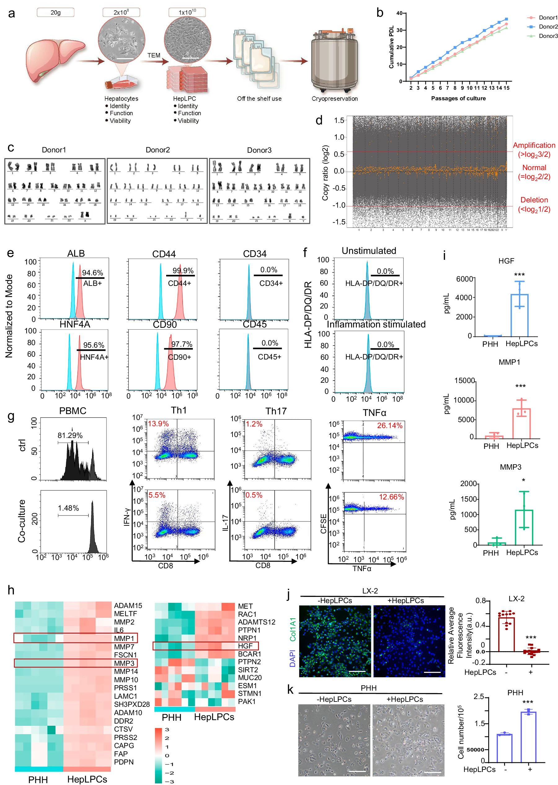 細(xì)胞特性與安全性驗(yàn)證:核型分析和全基因組測(cè)序證實(shí)了細(xì)胞的基因組穩(wěn)定性。流式細(xì)胞術(shù)分析顯示,HepLPCs同時(shí)表達(dá)肝臟特異性基因與干細(xì)胞/祖細(xì)胞基因,且不表達(dá)MHC II類抗原,具備低免疫原性。