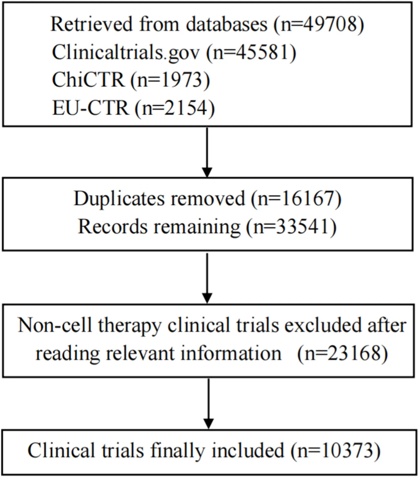 全球細(xì)胞療法臨床試驗(yàn)已形成美、中、歐三足鼎立之勢(shì),中國(guó)后發(fā)優(yōu)勢(shì)顯著。截至2025年10月31日,使用關(guān)鍵詞“細(xì)胞療法”、“T細(xì)胞”、“干細(xì)胞”、“CAR”、“TCR”、“TIL”、“DC”和“NK”在美國(guó)ClinicalTrials.gov、中國(guó)臨床試驗(yàn)注冊(cè)中心(ChiCTR)和歐盟臨床試驗(yàn)注冊(cè)中心(EU-CTR)進(jìn)行檢索,共檢索到32380條記錄。經(jīng)審查試驗(yàn)標(biāo)題和干預(yù)措施描述后,確認(rèn)其中10373項(xiàng)為細(xì)胞療法臨床試驗(yàn)(圖1)。