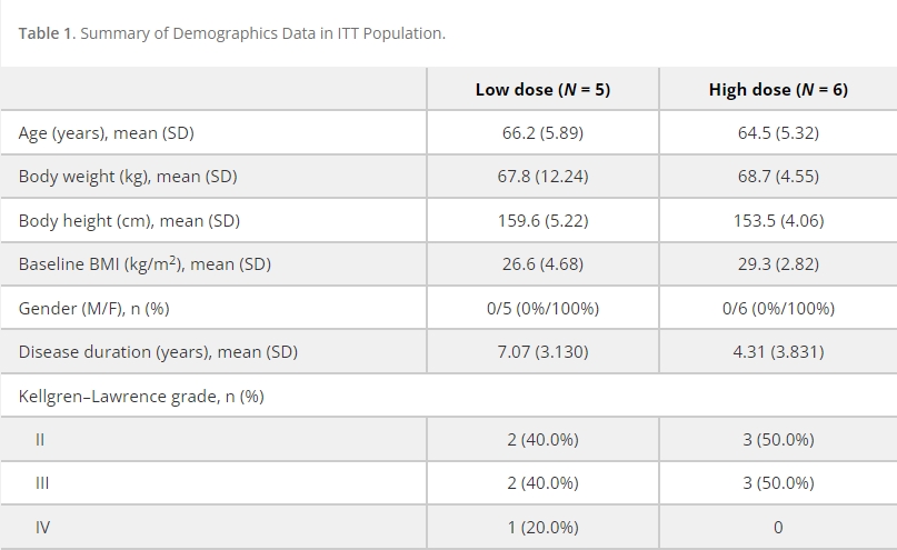 ITT人群的人口統計和基線特征如表1所示。在ITT人群中,低劑量組中所有受試者的平均 (SD) 年齡為66.2 (5.89) 歲,高劑量組中為64.5 (5.32) 歲。所有受試者的體重指數 (BMI) <35kg/m2,低劑量組中所有受試者的平均 (SD) BMI為26.6 (4.68) kg/m2,高劑量組中為29.3 (2.82)隊列。在這兩個隊列中,受試者均為膝關節骨關節炎II級至IV級的女性。自診斷以來膝關節OA的平均持續時間在低劑量組中為7.07 年,在高劑量組中為4.31年。