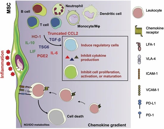 間充質干細胞的免疫抑制特性。受損組織總是伴隨著免疫細胞和間充質干細胞的浸潤。炎癥會觸發間充質干細胞中產生高水平的趨化因子和粘附分子,包括 CXCR3 配體、CCR5 配體、ICAM-1 和 VCAM-1。