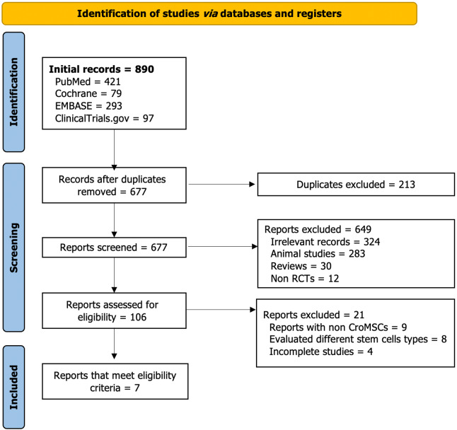 圖1:研究選擇流程圖(PRISMA 圖表)。RCT:隨機對照試驗;Cryo-MSC:冷凍保存的間充質干細胞。