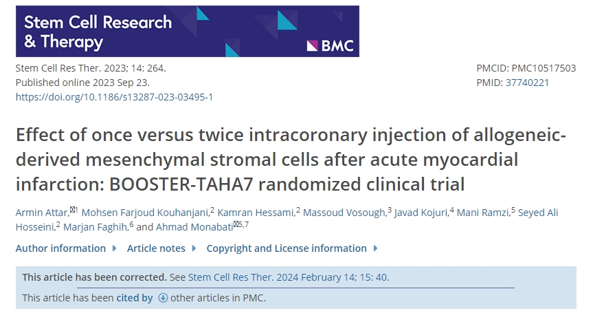 2023年,期刊《Stem Cell Research&Therapy》刊發一篇有關“急性心肌梗死后冠狀動脈內注射一次與兩次同種異體來源的間充質基質細胞的效果:BOOSTER-TAHA7隨機臨床試驗[2]