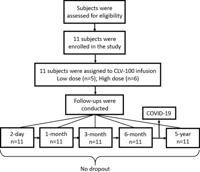 臨床測量指標:主要結局指標為確定CLV-100輸注的中期安全性(臨床和亞臨床結局),重點關注死亡、住院、相關不良事件和癌癥。次要結局指標包括基于亞臨床血清炎癥細胞因子評估的免疫調節作用。
