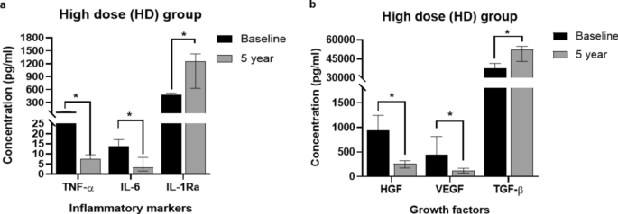 HD組在5年隨訪中維持了更強的抗炎表型:IL-1Ra水平較基線持續升高,且顯著高于LD組。同時,HD組的HGF水平和TGF-β升高趨勢更明顯,表明高劑量輸注可能通過持續調控HGF/TGF-β通路增強組織修復潛力(圖3b、5)。
