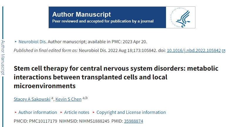 參考資料:Sakowski SA, Chen KS. Stem cell therapy for central nervous system disorders: Metabolic interactions between transplanted cells and local microenvironments. Neurobiol Dis. 2022 Oct 15;173:105842. doi: 10.1016/j.nbd.2022.105842. Epub 2022 Aug 18. PMID: 35988874; PMCID: PMC10117179.