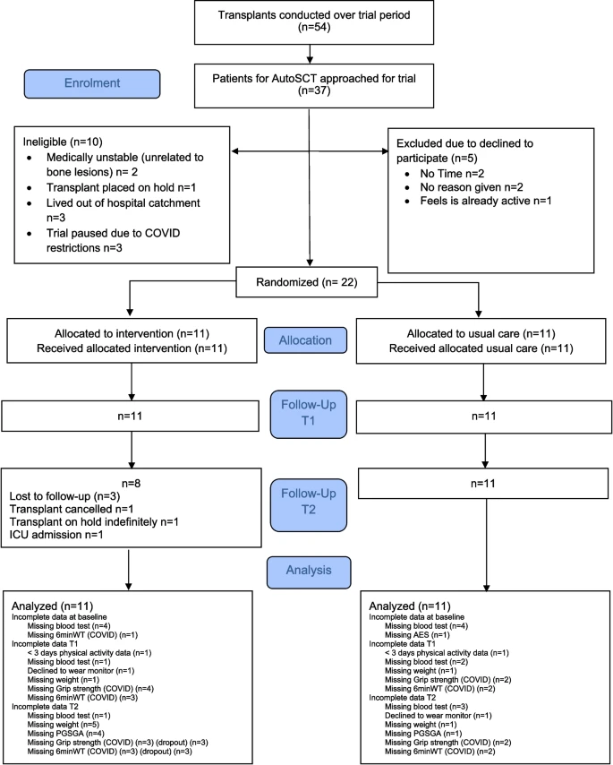 參與者被隨機分配接受每周兩次、監督的定制運動和每兩周一次的電話營養教育,最長持續8周,之后接受自體干細胞移植 (autoSCT??) 或常規護理 (?n=11)??。盲法評估分別在基線 (T0)、移植前 (T1) 和移植后4周 (T2) 進行。