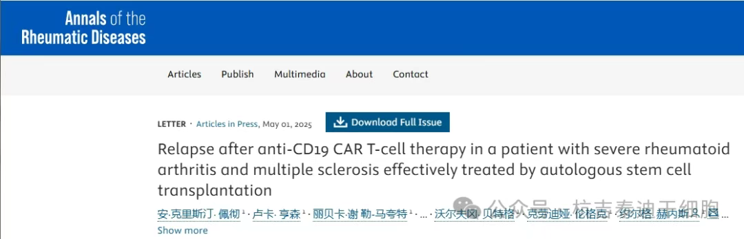 近期,國際著名期刊雜志“Annals of the Rheumatic Diseases”報道了一項“Relapse after anti-CD19 CAR T-cell therapy in a patient with severe rheumatoid arthritis and multiple sclerosis effectively treated by autologous stem cell transplantation”(一名嚴重類風濕性關節炎和多發性硬化癥患者接受抗CD19 CAR-T細胞治療后復發,經過自體干細胞移植后安全有效)的研究報道[1]。