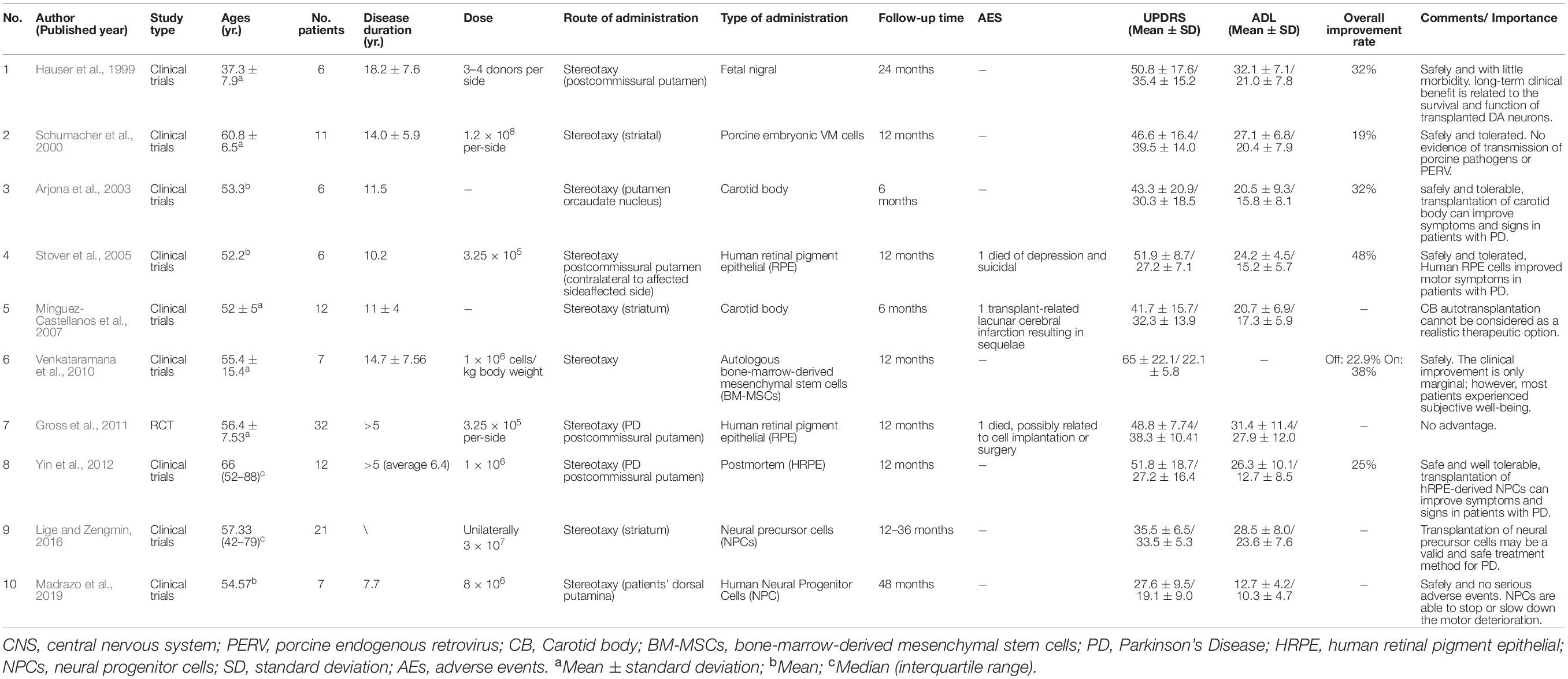 主要結果:表1顯示了最終文獻綜述中包含的文章的特征。這10項納入的研究是在1999年至2019年期間進行的,包括120名接受細胞療法的帕金森病患者。涉及五種類型的細胞療法,包括人類胎兒、豬胚胎、BM-MSCs、HRPE和NPC。所有研究均采用立體定向移植。七項研究報告了UPDRSIII的顯著改善,2項研究顯示結果不佳。安全性方面,7篇報道細胞移植安全且耐受性好,3篇報道細胞移植相關并發癥,包括抑郁自殺傾向、細胞移植相關腦梗死(有后遺癥)、細胞移植手術相關并發癥死亡(表1)。