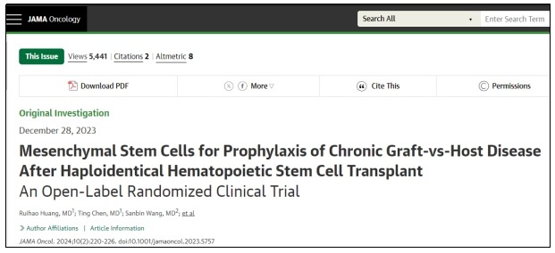 [1]Ruihao Huang, MD; Ting Chen, MD; Sanbin Wang, MD; Jishi Wang, MD; Yi Su, MD; Jing Liu, MD; Yanqi Zhang, PhD; Xiangyu Ma, PhD;Qin Wen, MD; Peiyan Kong, MD; Cheng Zhang, MD; Lei Gao, MD; Jiang F. Zhong, PhD; Li Gao, MD; Xi Zhang, MD, PhD.Mesenchymal Stem Cells for Prophylaxis of Chronic Graft-vs-Host Disease After Haploidentical Hematopoietic Stem Cell Transplant An Open-Label Randomized Clinical Trial.JAMA Oncology February 2024 Volume 10, Number 2.