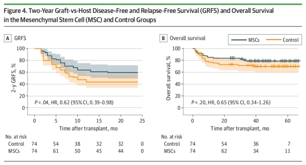 3.無復發生存率(GRFS):MSCs組預估2年GRFS為59.5%(95% CI,48.1%-69.9%),對照組為26.2%(95% CI,17.6%- 37.2%),HR為0.62(95 % CI,0.39-0.98,圖4A)。盡管兩之間沒有顯著差異,但MSCs組患者的OS曲線有潛在改善(圖4B)。此外,MSCs組沒有出現cGVHD相關死亡病例,而對照組有5例患者死于cGVHD相關并發癥。此外,MSCs組中有嚴重出血性膀胱炎的患者癥狀得到明顯改善。