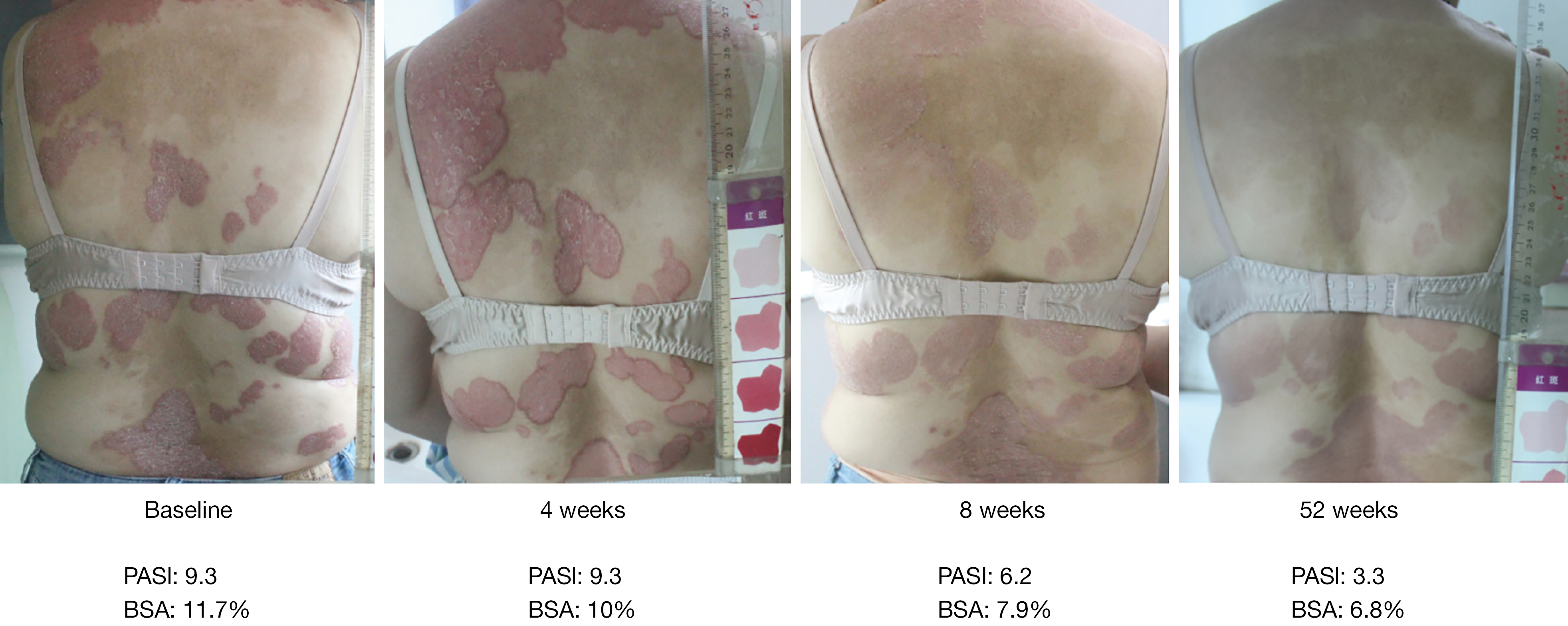 這四張圖片是其中一名參與者在治療前后的皮膚圖像。從圖像上看,治療后病灶的紅斑、脫屑和浸潤均有明顯好轉。PASI評分從基線(治療前9.3)到治療后52周(3.3)逐漸下降。BSA也有所下降(從 11.7% 下降到6.8%)。參與者在第52周達到 PASI-50。BSA,體表面積;PASI、銀屑病面積和嚴重程度指數。