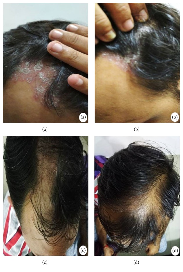 一位患有尋常型銀屑病2年的38歲男性患者來我中心就診。對患者的初步檢查顯示,包括耳后區域在內的整個頭皮上都有許多帶有許多銀色鱗屑的紅斑。銀屑病頭皮嚴重程度指數 (PSSI) 評估疾病的嚴重程度為28,該指數通過結合嚴重程度(紅斑、硬結和脫屑)和受影響區域百分比的標準方法計算。