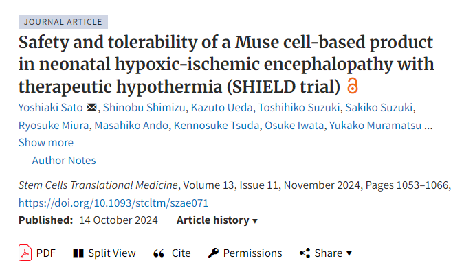 [7]Sato Y, Shimizu S, Ueda K, Suzuki T, Suzuki S, Miura R, Ando M, Tsuda K, Iwata O, Muramatsu Y, Kidokoro H, Hirakawa A, Hayakawa M; SHEILD team. Safety and tolerability of a Muse cell-based product in neonatal hypoxic-ischemic encephalopathy with therapeutic hypothermia (SHIELD trial). Stem Cells Transl Med. 2024 Nov 12;13(11):1053-1066. doi: 10.1093/stcltm/szae071. PMID: 39401019; PMCID: PMC11555474.