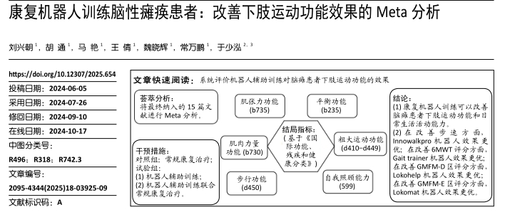 下肢外骨骼機器人:康復機器人訓練可以改善腦癱患者下肢運動功能和日常生活活動能力。2024年《中國組織工程研究》研究顯示,在改 善 步 速 方 面,Innowalkpro機器人效果更優;在改善6MWT評分方面,Gait trainer機器人效果更優;在改善GMFM-D區評分方面,Lokohelp機器人效果更優;在改善GMFM-E區評分方面,Lokomat機器人效果更優。[11]