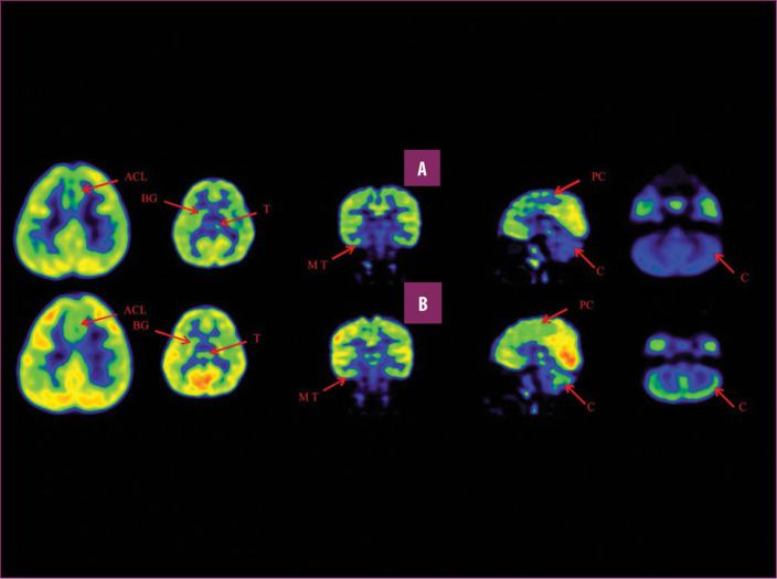 前扣帶回 (ACL)、頂葉皮層 (PC)、內側顳葉皮層 (MT)、基底神經節 (BG)、丘腦 (T) 和小腦 (C)。B 行)第一次移植后6個月后PETCT腦部掃描的干預后圖像顯示標記區域有所改善。藍色代表代謝減退區域。綠色代表正常的新陳代謝區域。圖A和B的比較顯示藍色區域顯著減少,綠色區域增加,這表明大腦的新陳代謝得到改善。
