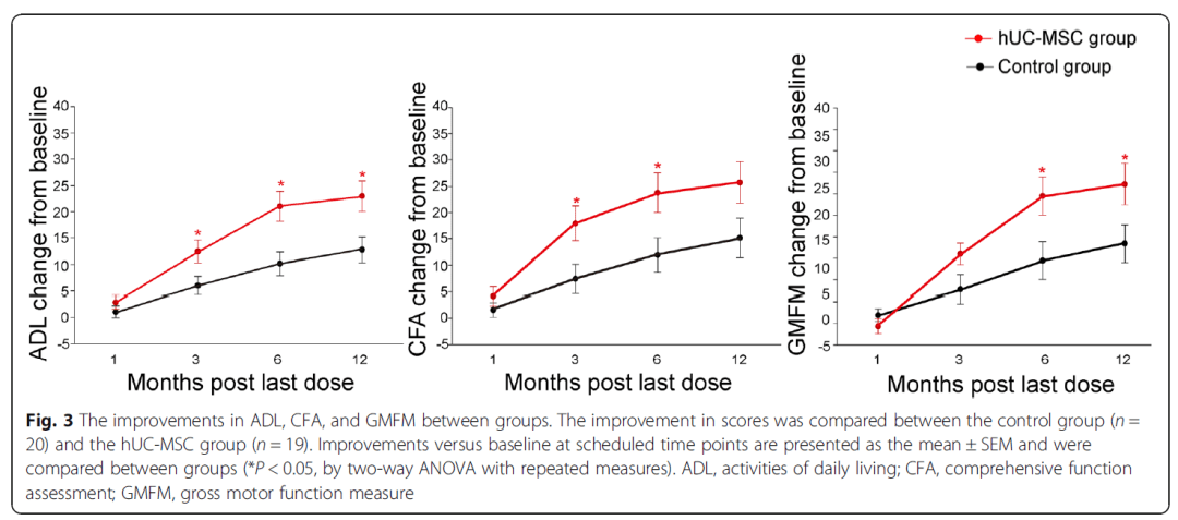 40例符合條件的患者隨機分為hUC-MSC(人臍帶間充質(zhì)干細(xì)胞)治療組和對照組。除康復(fù)治療,hUC-MSC組接受4次靜脈輸注hUC-MSCs,對照組則接受安慰劑。通過12個月的隨訪進(jìn)行安全性評估(通過不良事件(AEs) )和有效性評估(通過日常生活活動能力(ADL)量表、綜合健康功能評估(CFA)和粗大運動功能評估量表(GMFM)?)。