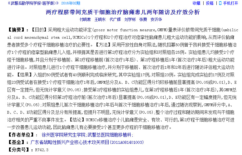 2016年,徐州醫(yī)學(xué)院研究生學(xué)院研究人員發(fā)表論文,旨在采用粗大運動功能評定量表評價臍帶間充質(zhì)干細(xì)胞1個療程和2個療程治療對痙攣性腦癱患兒粗大運動功能的影響,從而評價腦癱患者接受多個療程干細(xì)胞移植治療的必要性。研究指出,臍帶間充質(zhì)干細(xì)胞移植治療小兒腦癱是安全、有效、可行的,第2療程干細(xì)胞移植治療可進(jìn)一步改善患兒運動功能,因此腦癱患兒有必要接受2個甚至更多療程的干細(xì)胞移植治療。該文發(fā)表在2016年第02期《武警后勤學(xué)院學(xué)報(醫(yī)學(xué)版)》雜志上。