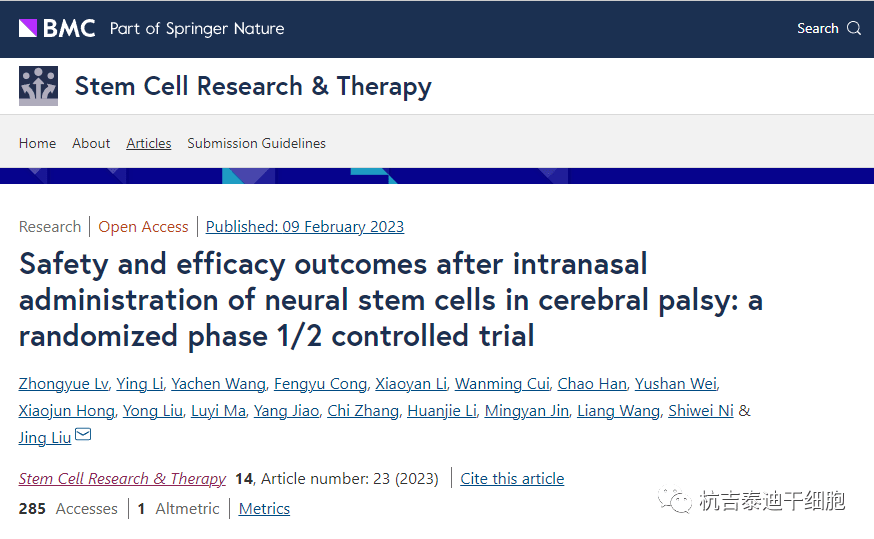 2023年2月,大連醫(yī)科大學(xué)第一附屬醫(yī)院劉晶教授在《StemCell Research &Therapy》期刊雜志上發(fā)表了一篇關(guān)于《腦癱神經(jīng)干細(xì)胞鼻內(nèi)給藥后的安全性和有效性結(jié)果:一項隨機1/2期對照試驗》的論文。