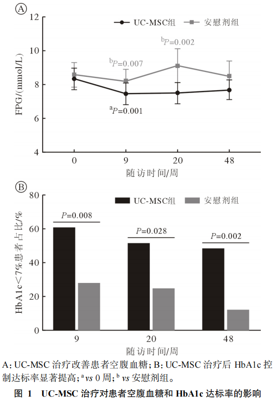 2.血糖達(dá)標(biāo)率顯著提高:UCMSC治療組患者的糖化血紅蛋白(HbA1c)水平顯著降低,并有更多患者將血糖控制在理想范圍(<7%)。與對(duì)照組相比,干細(xì)胞治療的效果更加突出,顯示了這一療法在控糖方面的強(qiáng)大潛力。